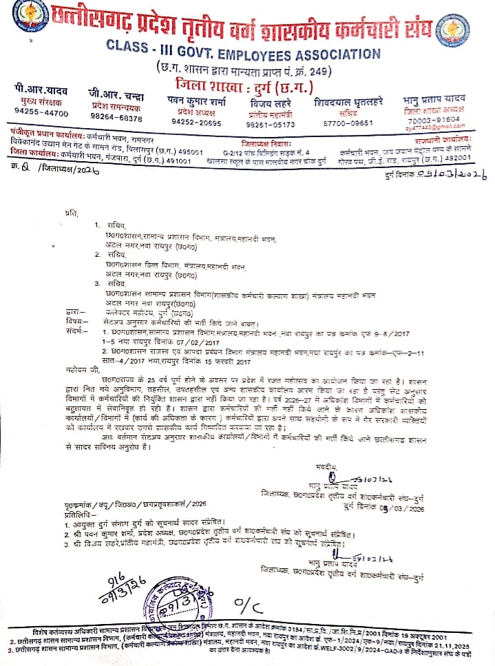 IMG-20260309-WA0050 Post navigation Previous: शासकीय विभागों में सेटअप अनुसार कर्मचारियों की भर्ती किये जाने कलेक्टर दुर्ग को ज्ञापन-जिलाध्यक्ष छ0ग0प्रदेश तृतीय वर्ग शा0कर्मचारी संध…