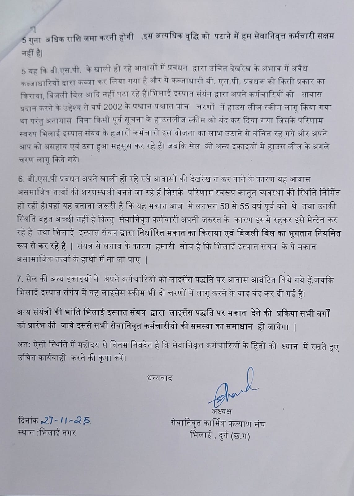 IMG-20251127-WA0017 Post navigation Previous: भिलाई इस्पात संयंत्र के एजीएम एच आर जया राय को रिटेंशन योजना के तहत आवास ले कर रह रहे सेवानिवृत्त कर्मचारियों पर एकतरफा किराये में की गई भारी बढ़ोतरी का विरोध करते हुए ज्ञापन सौंपा गया।