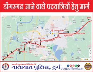 यातायात पुलिस दुर्ग समस्त पदयात्रियों एवं वाहन चालकों से अपील करती है कि निर्धारित मार्ग एवं यातायात नियमों का पालन करें। पदयात्री सड़क के बाएं ओर चलें, रिफ्लेक्टिव सामग्री का उपयोग करें एवं सड़क पर विश्राम न करें। वाहन चालक सावधानीपूर्वक वाहन चलाएं, निर्धारित डायवर्सन का पालन करें तथा किसी भी प्रकार की लापरवाही से बचें।