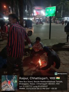 रायपुर नगर निगम द्वारा राजधानी शहर में जयस्तम्भ चौक के पास, नेताजी सुभाष स्टेडियम, मेकाहारा परिसर, पुराना बस स्टेण्ड पंडरी, रेल्वे स्टेशन के पास,शंकर नगर, अवंति विहार कॉलोनी, टाटीबंध चौक, कबीर नगर हाउसिंग बोर्ड कॉलोनी, सरोना, चंगोराभाठा बाजार, चन्दनीडीह, महोबा बाजार, हीरापुर चौक, बड़ा अशोक नगर सहित लगभग 30 से भी अधिक प्रमुख विभिन्न सार्वजनिक स्थानों में आमजनों को शीतलहर से सुरक्षा देने अलाव जलाने की प्रतिदिन नियमित व्यबस्था, प्रतिदिन सैकड़ो आमजनों को लगातार बढ़ती शीतलहर से मिल रही त्वरित राहत …